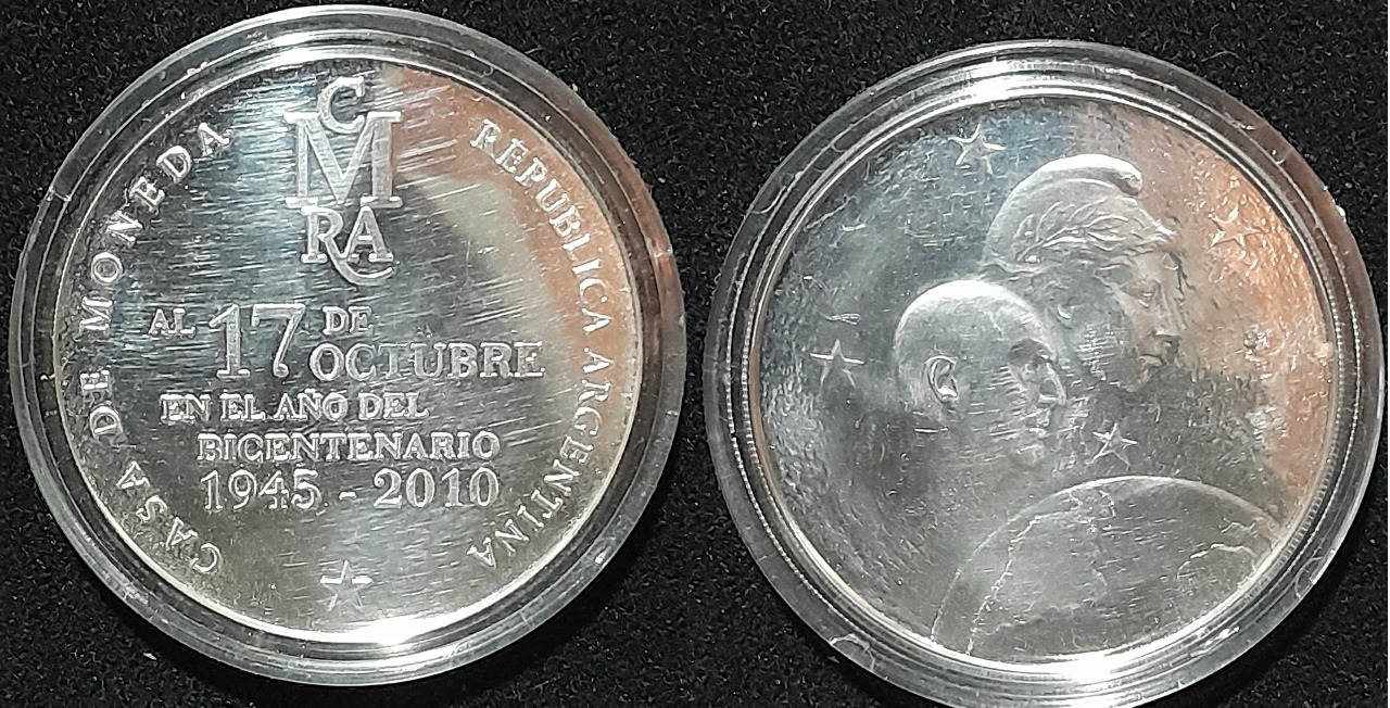 CASA DE MONEDA REPÚBLICA ARGENTINA - AL 17 DE OCTUBRE - EN EL AÑO DEL BICENTENARIO - (1945 - 2010) METAL PLATA 900 - 40 MM